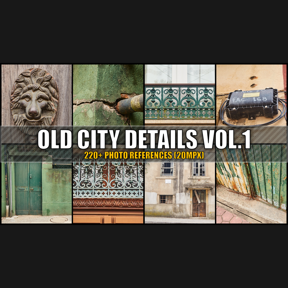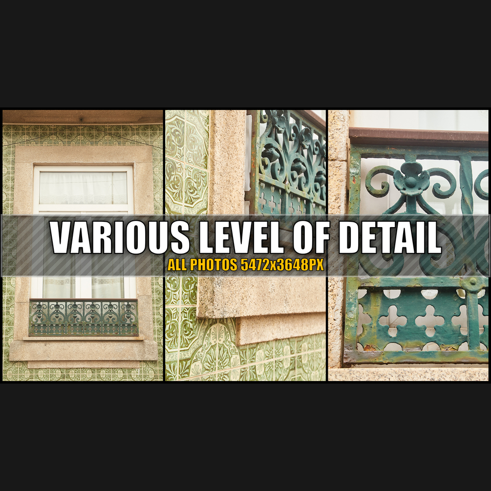 That is why I have prepared this set of 220+ Hi-Res photos (5472x3648px). It consists of photographs of several different locations in the old city of Portugal: workers' houses, more prestigious houses, abandoned buildings etc. There are also detailed photographs of damaged parts of buildings, fences, road hatches, distribution boxes, peeling paint etc. All objects/buildings have a general view, slightly closer shots (doors, windows, walls), as well as close-up photographs of details, materials and textures. This set will be useful for those who are working on Environments, Props, Materials, Textures, Concepts.